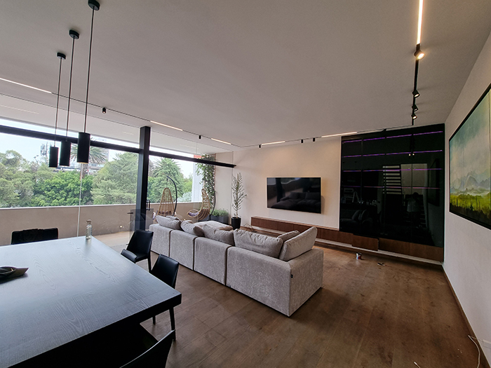 Rieles magnéticos, iluminación RGBW y muebles integrados con control CASAMBI para un ambiente moderno y flexible.