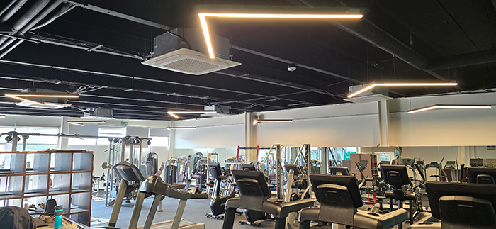 Iluminación vanguardista para gimnasio industrial. Ambientes energéticos que rompen con la rutina laboral.